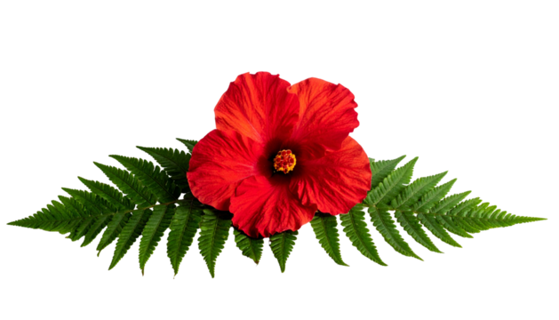 Vivid red flower blossoms with lush green fern fronds on a stark black background
