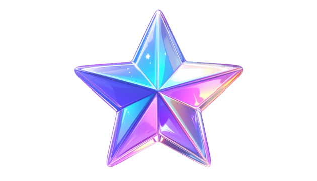 A colorful, glossy, five-pointed star with iridescent blues, pinks, and purples shines against a black background
