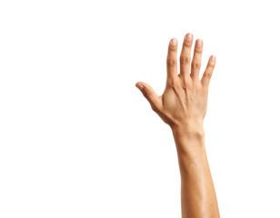 A cupped hand gestures outward