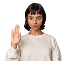 Young Hispanic woman with short black hair in studio standing with outstretched hand showing stop sign, preventing you.
