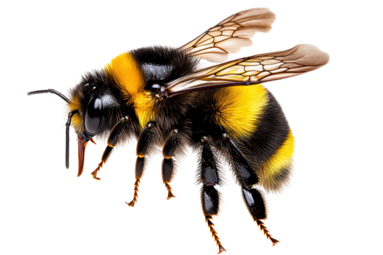 Bumblebee with vibrant yellow and black stripes isolated on a transparent background showcasing its detailed wings and body structure