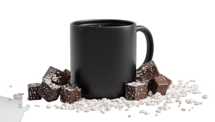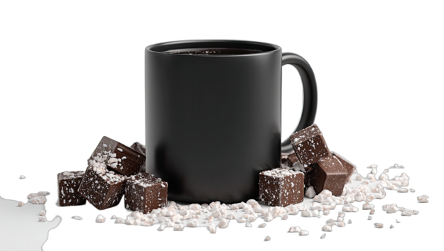A black mug of hot chocolate with chocolate chunks dusted with sugar