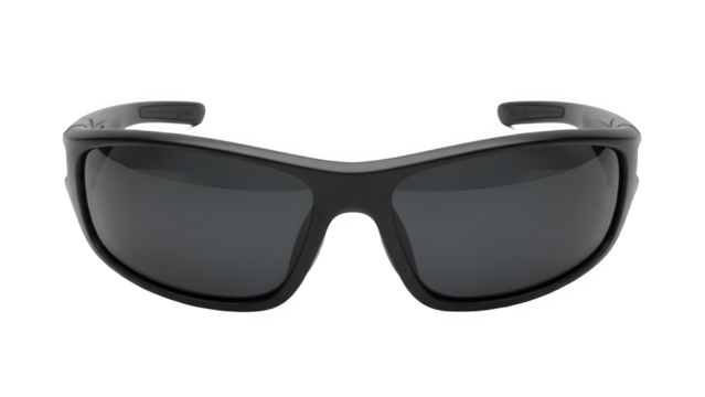 Classic black wayfarer sunglasses with dark lenses on transparent background
