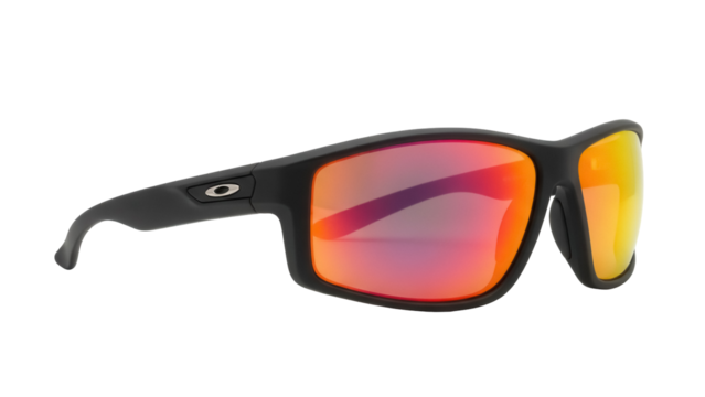 Sporty black sunglasses with red and yellow lenses isolated PNG, modern eyewear for outdoor activities and sun protection