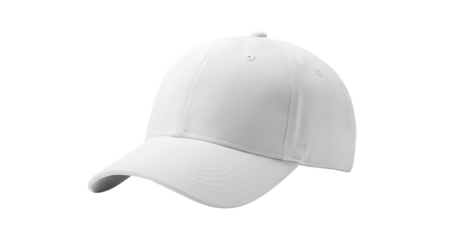 A close up view of a plain white baseball cap isolated against a black background in a studio shot on transparent background