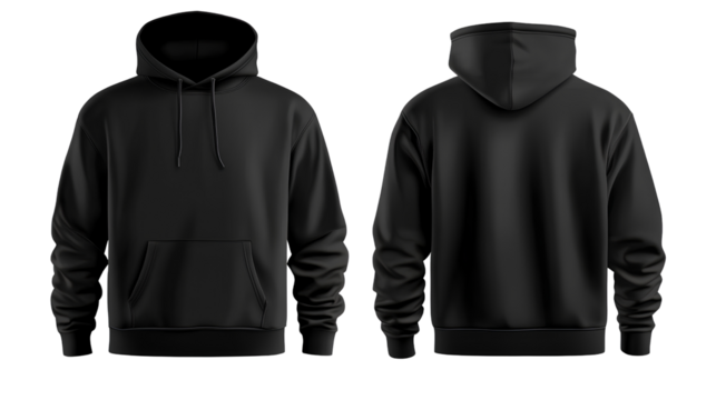 black hoodie template, front and back view, isolated on a transparent background. png format