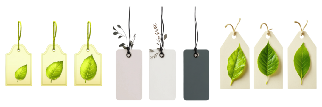 Six rectangular gift tags in white brown black and blue with strings isolated on a transparent background