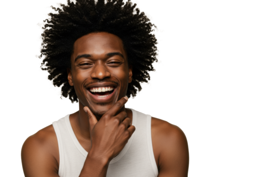 A radiant young black man with voluminous dark curly hair, in a white tank top, laughing heartily with hand on chin against a beige studio background and copy space, authentic joy concept