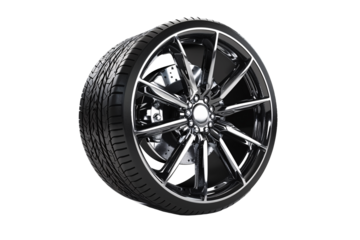 8 black and white car wheel icons with sporty, modern rim designs. Suitable for automotive brands, tire shops, apps, ads, and infographics. Vector style, easy to scale and customize.