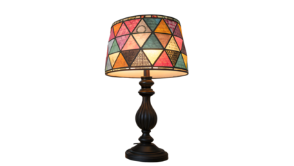 Colorful geometric patterned lampshade on ornate black lamp base isolated on a transparent background