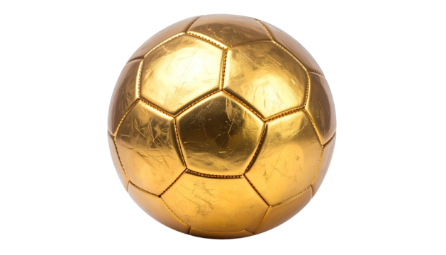 A close-up studio shot showcases a golden soccer ball with reflective surfaces, its pentagons and hexagons distinct. The ball floats against a black void