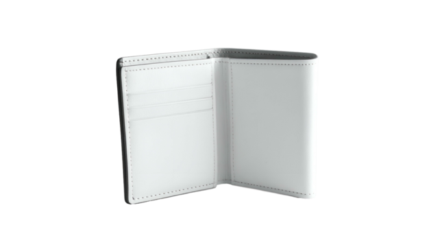 A 3D render of an open, empty wallet against a stark black background. The wallet is white and has visible stitching details
