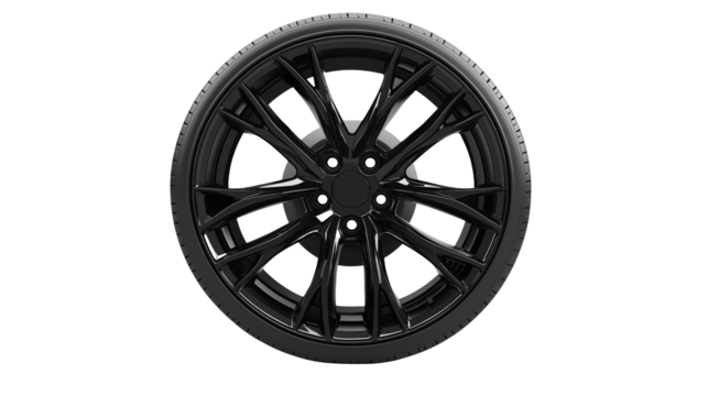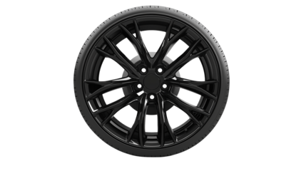 Glossy black wheel Alloy car wheels Rim or Mag Wheel high performance auto part decoration isolated on cut out PNG or transparent background. Realistic template pattern. Beautiful car accessories.