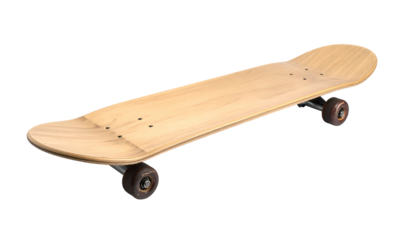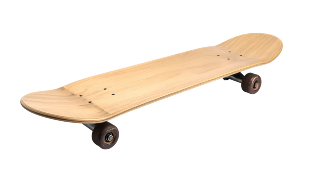 A light brown wooden skateboard, its deck facing up, wheels and trucks visible, isolated on a black background