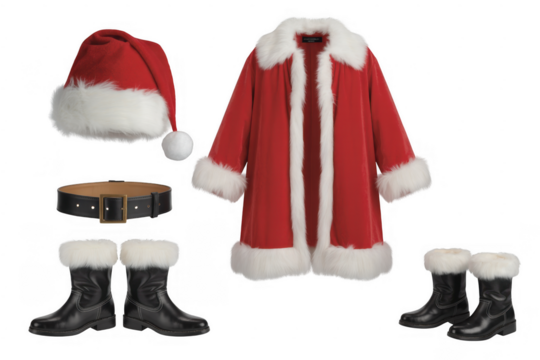 Santa Claus costume and accessories on black white isolated on a transparent background