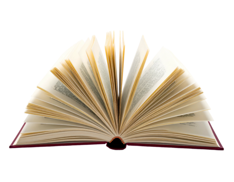 An open book, with its pages fanned out, sits on a transparent surface against a black background