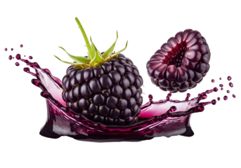 Fresh blackberries in vibrant juice splash against a stark black background, showcasing juicy fruit and dynamic action.