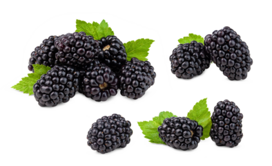 Close-up of fresh blackberries with green leaves on a transparent background.