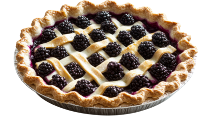 Freshly baked blackberry pie slice showcasing a lattice crust and juicy berry filling, isolated on a transparent background