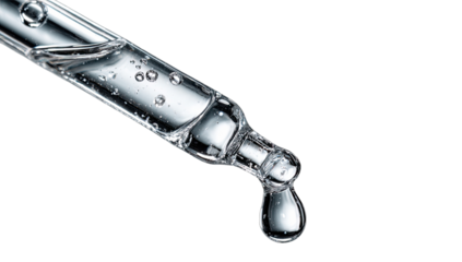 Clear liquid with bubbles drips from a glass pipette tip on black