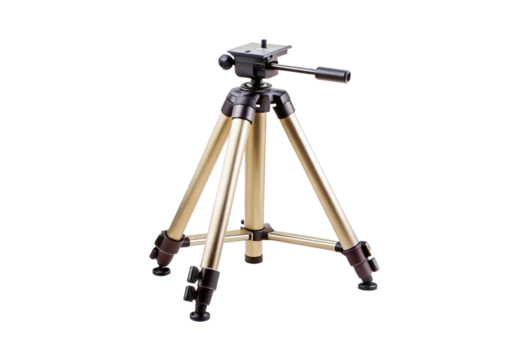 Isolated photo of a gold colored camera tripod with a black head on white