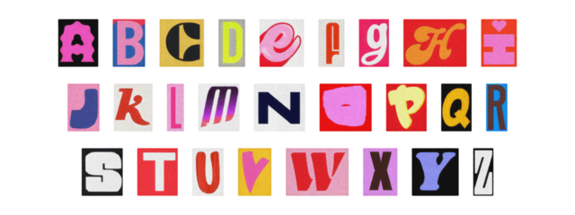 A set of alphabets cut out from a magazine or newspaper in pop art style. Cut out letters on a transparent background, PNG.