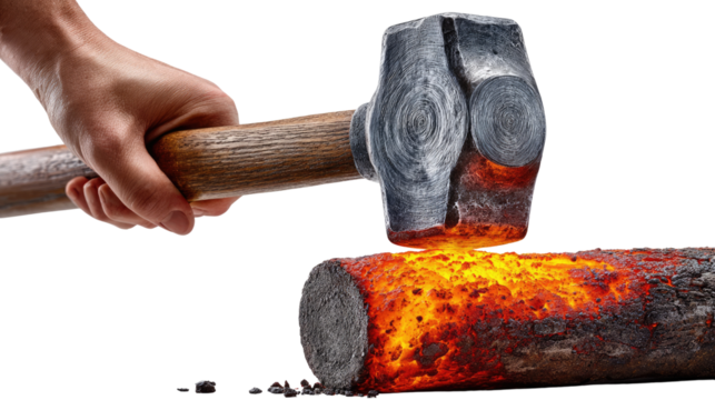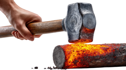 Forging with Precision: A close-up view capturing the intense artistry of a craftsman as he wields a heavy hammer to shape glowing metal with focused precision.
