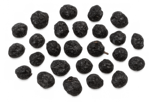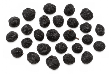 Close-up of dried prunus spinosa fruits, showcasing texture and transparent background, ideal for food and beverage projects