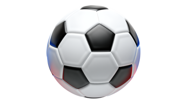 White Soccer Ball with Black and Blue Accents, Glossy Texture on Transparent Background, 3D Realism Design Element