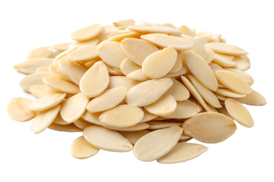 Heap of blanched sliced almonds showing healthy snack, baking ingredient, and nutritious food concept