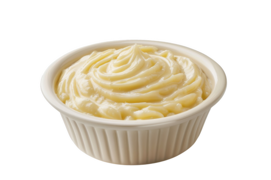 A small white bowl filled with creamy, smooth mayonnaise. Isolated on a transparent background.