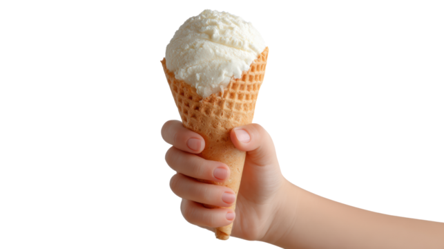 Hand holding a cone of vanilla ice cream on a white isolated background.