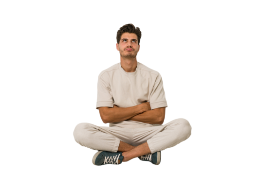Young caucasian man sitting on the floor isolated on white background tired of a repetitive task.