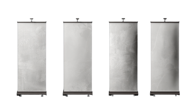 Three blank white roller banner stands for trade show marketing and advertising transparent backgroundon transparent background