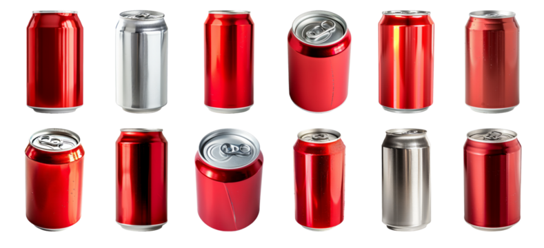 Red and silver soda cans collection isolated cut out on transparent background