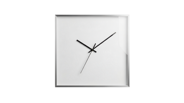Minimalist Modern Square Wall Clock with Silver Frame and White Face isolated PNG with Transparent Background