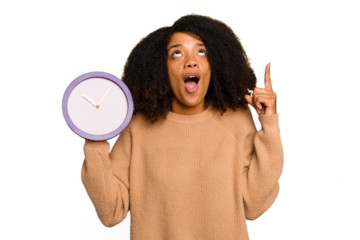 Young African American holding a clock isolated pointing upside with opened mouth.