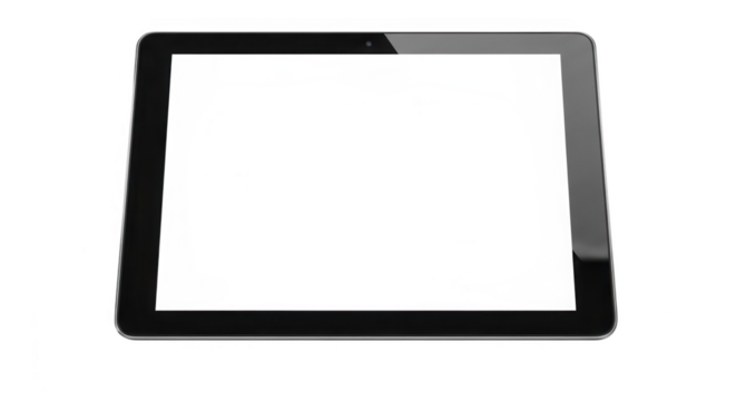 Hands holding a tablet computer with a blank white screen, isolated on transparent background