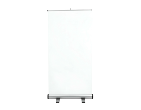 Three blank white roll up banner stands displayed side by side isolated on transparent background