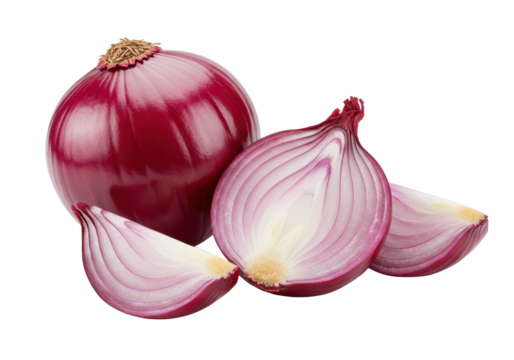 Whole, half, and quarter-cut vibrant red onions with glossy skin and intricate translucent inner layers, isolated on a transparent background with copy space, concept of fresh organic food