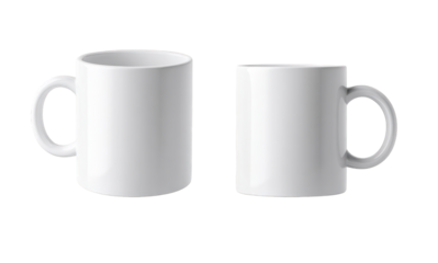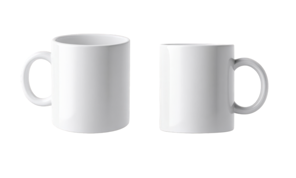 Two blank white mugs, front and side views