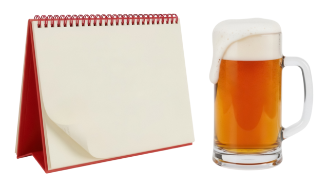Beer mug with overflowing foam and blank calendar isolated PNG, refreshing drink for celebrations and events on transparent background