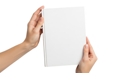 Hands holding blank white book cover mockup isolated on transparent background