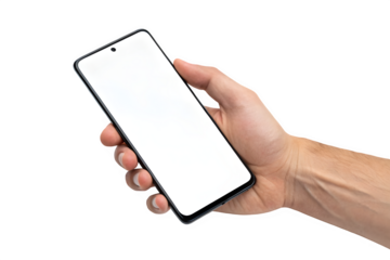 Hand holding a smartphone with blank screen isolated on transparent background