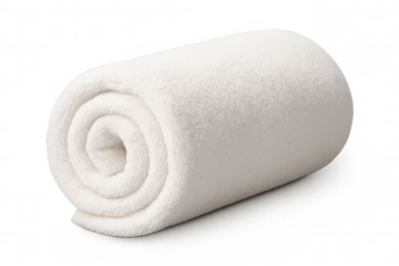 White fleece blanket rolled up, presenting a concept of comfort, warmth, and coziness with a fluffy texture. Transparent background