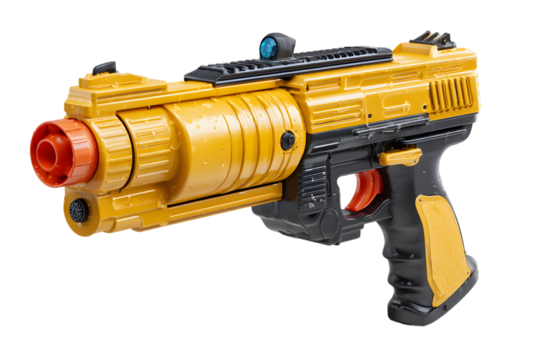 Close-up Studio Shot of a Futuristic Yellow and Black Toy Gun on transparent backdrop