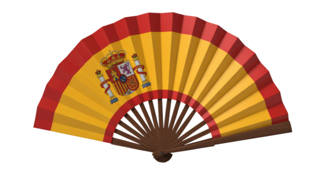 A vibrant Spanish flag hand fan, partially open, displaying the national coat of arms in red and yellow with a wooden base. background removed