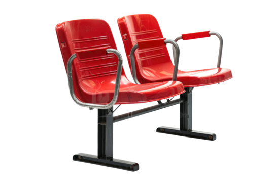 Row of red stadium seat isolated on transparent background, providing comfortable seating for spectators at sporting event and entertainment venue