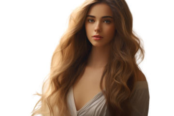 A young woman with long, flowing hair stands against a soft, blurred background. Her skin is radiant and smooth, Isolated on white background
