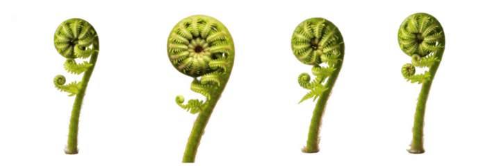 Set of Fresh Fiddlehead Ferns Collection (Matteuccia struthiopteris), Organic Wild Edible Fern Vegetable Illustration for Gourmet, Seasonal and Healthy Food Design, isolated on transparent PNG backgro